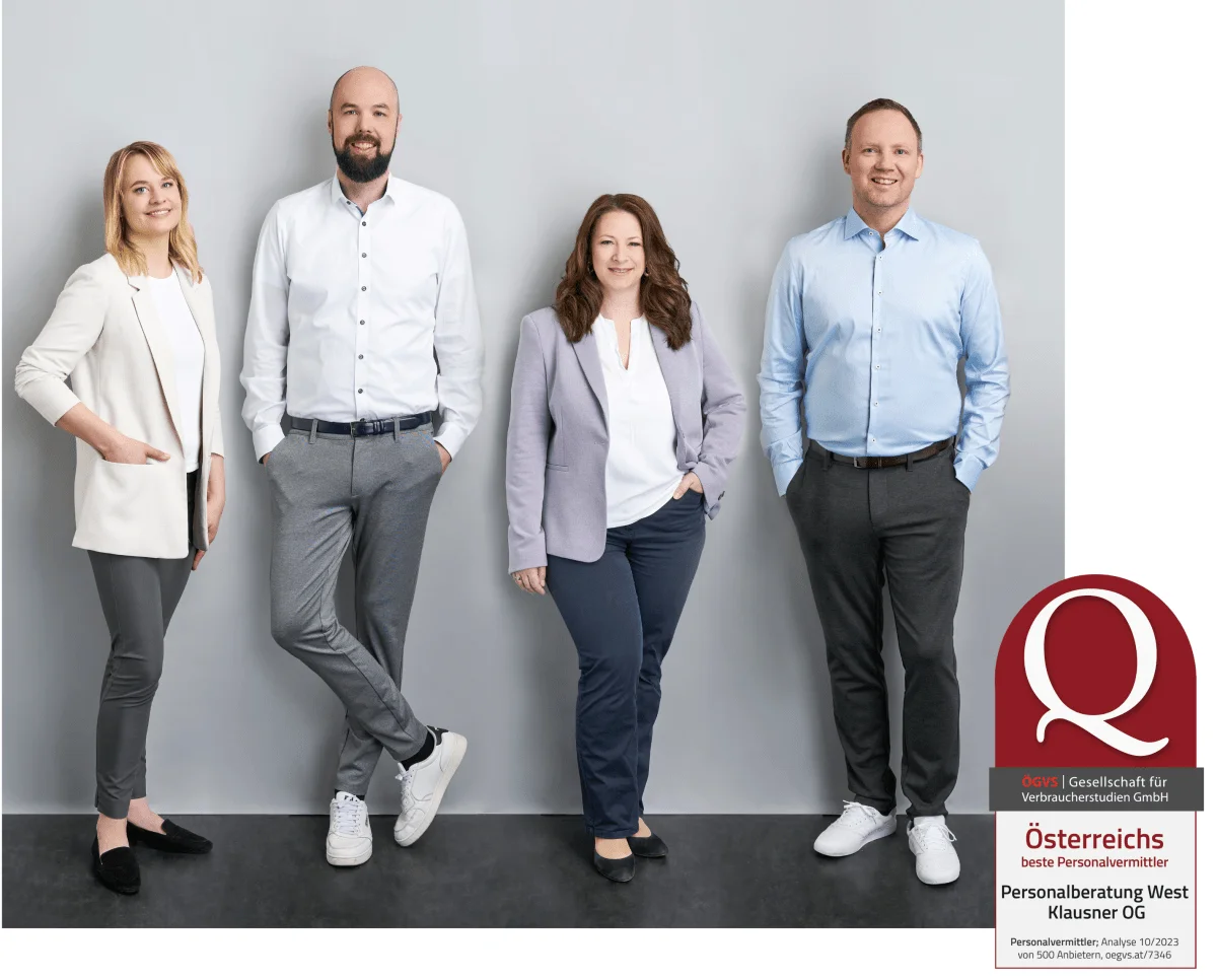 Spezialisiert auf die Bereiche HR, Recruiting, Direktansprache und Digital Marketing. Ausgezeichnet von der ÖGVS als eine der besten Personalvermittlungen Österreichs – eine Auszeichnung, die unsere konsequente Qualitätsorientierung und Kundenzufriedenheit bestätigt. Erfahren Sie mehr über uns (v.l.n.r.): Christina Pancheri, Hannes Klausner, Elisabeth Klausner und Franz Pancheri. Wir freuen uns darauf, Sie kennenzulernen.